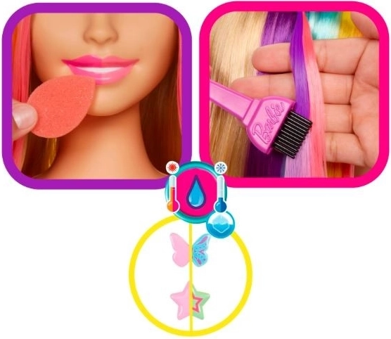 So stylingovými hlavami Barbie sa kaderníkom môže stať každý! Prvky meniace farbu dodávajú hre čarovný rozmer a doplnky dávajú voľný priechod tvojej kreativite. Vyberaj si z rôznych modelov s jedinečnými účesmi a množstvom stylingových prvkov. Súčasťou sád je aj praktický úložný priestor v základni hlavy, takže po skončení hrania možno všetko príslušenstvo ľahko uložiť. Predáva sa samostatne v závislosti od dostupnosti. Farby a dekoratívne prvky sa môžu líšiť.