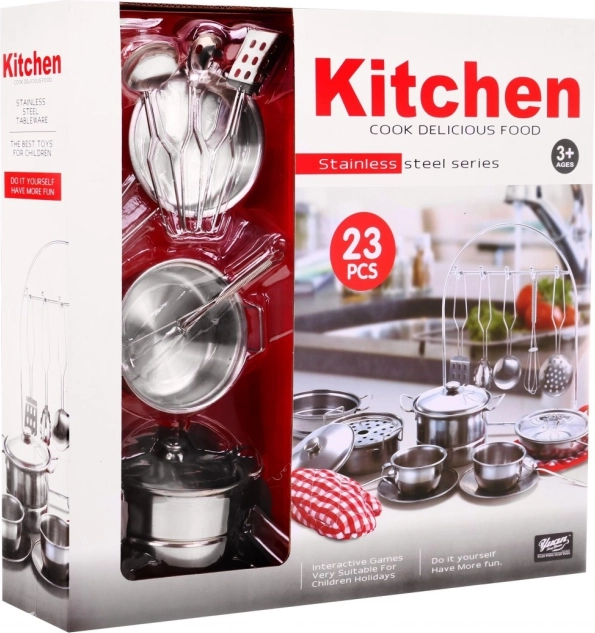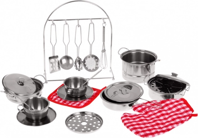 Tento set obsahuje rôzne kovové hrnce, panvice a riad pre autentický herný zážitok. Dieťa si môže vychutnať hru s reálne vyzerajúcimi kuchynskými potrebami.