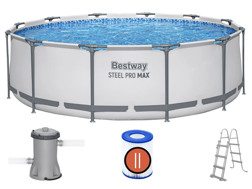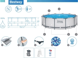 Súčasťou je filtračné čerpadlo s kartušou typ II, hadice a spony, sitká, záslepky, opravná záplata aj bezpečný odnímateľný rebrík.