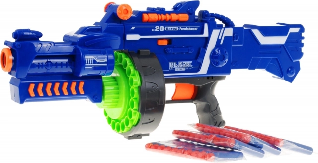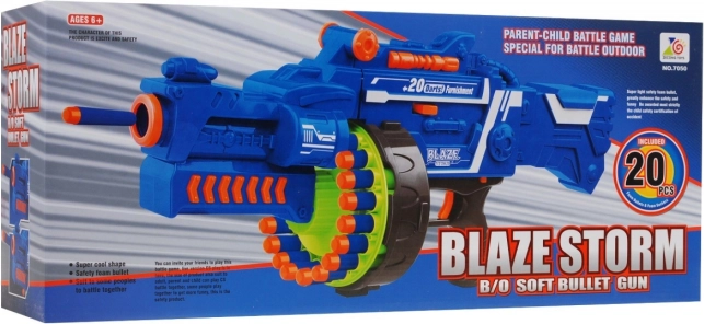Polautomatický blaster BLAZE STORM prináša dynamickú, ale bezpečnú zábavu pre malých aj veľkých. Elektrický kompresor poháňaný 5 batériami AA zvládne až 3 šípky za sekundu, bubnový zásobník pojme 20 šípok a dosahuje približne 10 metrov. Vďaka poistke spúšte ON/OFF a ochrane proti zaseknutiu je hranie plynulé a bez starostí. Dve stabilizačné valčeky v hlavni pomáhajú k presnejším výstrelom a sklopná pažba uľahčuje nabíjanie aj manipuláciu.