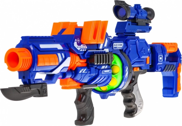 Hľadáte akčnú zábavu na záhradu aj do interiéru? BLAZE STORM v modernom modro‑oranžovom prevedení je ľahký, odolný a pripravený na dlhé súboje s priateľmi. Plne automatický pohon na batérie zabezpečuje plynulé dávky streľby, zatiaľ čo bubnový zásobník sa stará o rýchle nabíjanie a spoľahlivý chod.