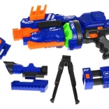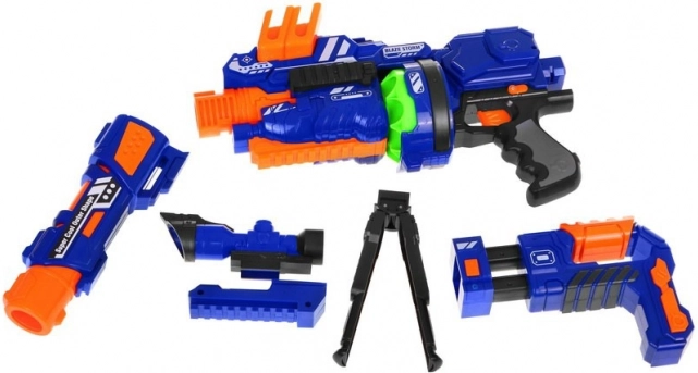 Modulárna detská puška Blaze Storm prináša akčnú, ale bezpečnú zábavu doma aj vonku. Elektrický poloautomat s bubnovým mechanizmom a zásobníkom umožňuje rýchle jednotlivé výstrely aj krátke série, pritom penové guličky sú mäkké a šetrné. Vďaka čelovníku, stabilizátoru a možnosti predĺženia hlavne sa deti môžu naučiť presne mieriť a vytvárať rôzne herné scenáre.