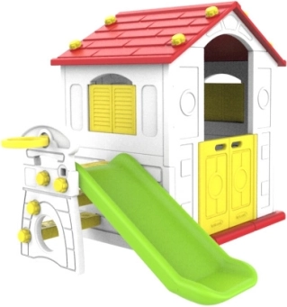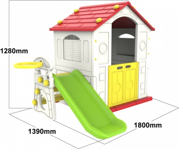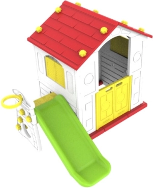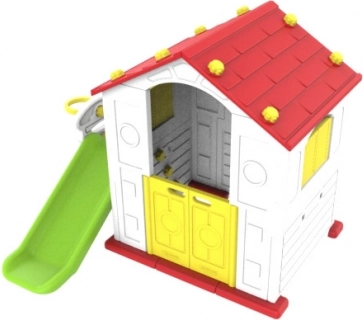 Detský záhradný domček je ideálne miesto pre nekonečnú zábavu. S jeho červenou strechou, farebnými detailmi a šmykľavkou ponúka mnoho možností pre hru a rozvoj detskej fantázie.