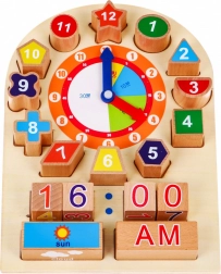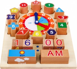 Tento drevený hodinový set pomôže vášmu dieťaťu naučiť sa ľahko rozpoznávať čas, poru dňa, počasie a mesiace. Obsahuje dve pohyblivé ručičky, ktoré je možné voľne nastaviť pre rôzne hodiny. Dieťa môže okamžite zapisovať čas pomocou číselných kociek a tiež rozpoznať dennú dobu, či je slnečno, zamračené, daždivo alebo sneží. Číselné kocky majú rôzne tvary, ktoré treba správne usadiť na tabuľu.