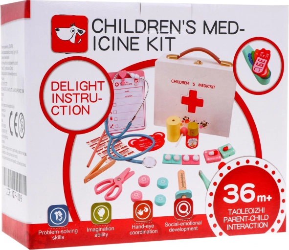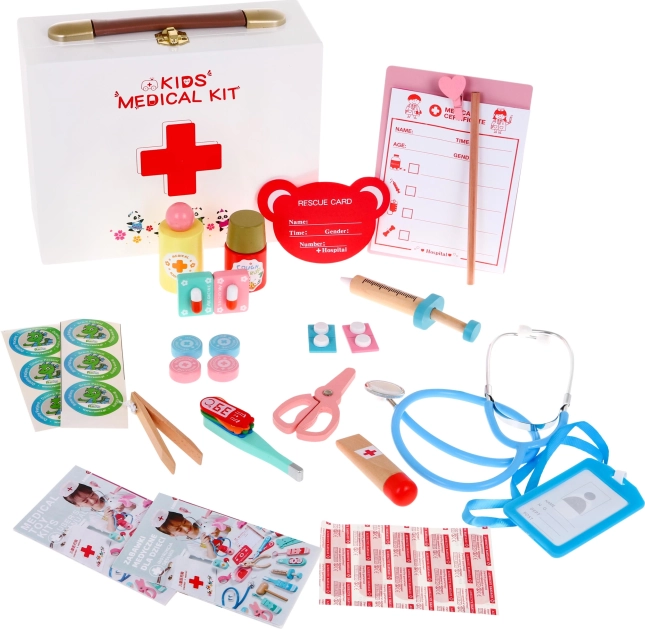 Táto drevená lekárska súprava obsahuje všetko, čo malý lekár potrebuje na ošetrenie svojich pacientov. Súprava obsahuje 30 rôznych dielov, ktoré svojimi tvarmi a farbami napodobňujú skutočné lekárske nástroje. Vďaka tejto súprave deti nielenže prekonávajú strach z lekárov, ale tiež si užívajú hru plnú fantázie a radosti. Jednotlivé prvky súpravy sú priateľské a farebné, čo zaručuje, že deti budú zaujaté a budú radi objavovať.