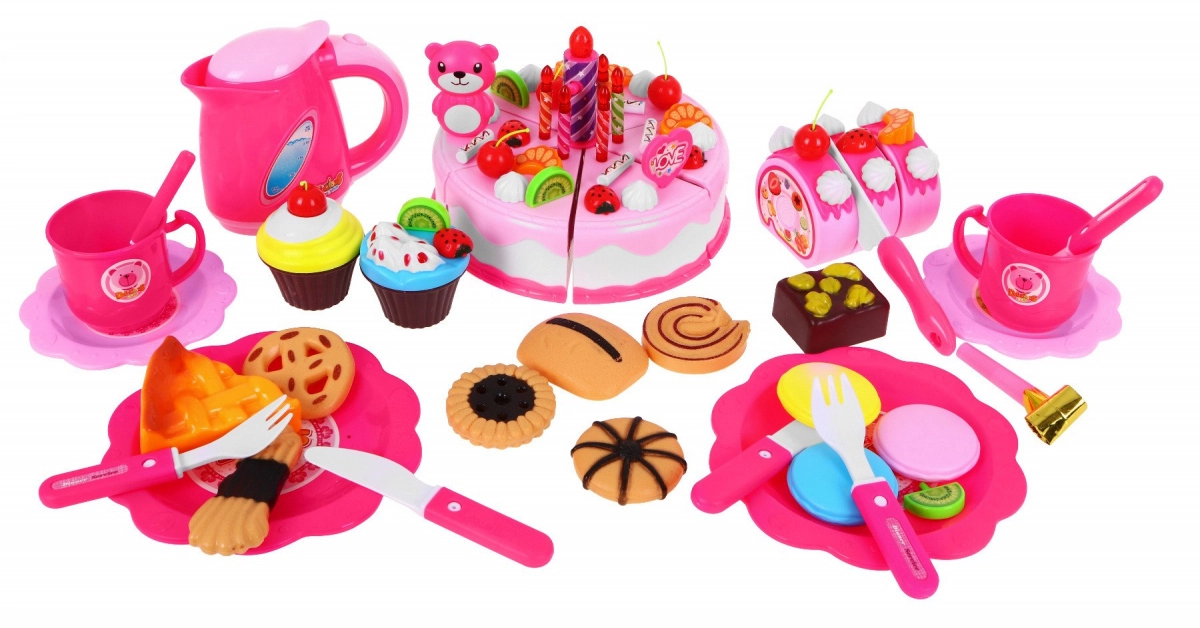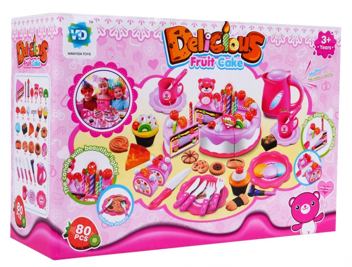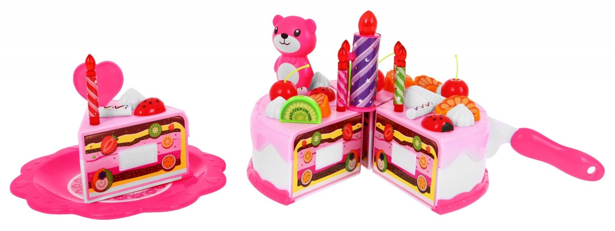- 6 dielikov torty; 7 sviečok (1 veľká svietiaca cca 6,5 × 2 cm, malé cca 4,5 × 0,5 cm); 12 pusiniek (cca 2 × 2 cm); 5 čerešní (cca 4,5 × 2,5 cm); figúrka medvedíka (cca 6,5 × 4,5 cm); 4 kiwi (cca 2,5 × 2,5 cm); 5 jahôd (cca 2,5 × 2,5 cm); 5 mandarínok (cca 2,5 × 2 cm); 5 cukrárskych tyčiniek (cca 2,5 × 2,5 cm); 2 muffiny (cca 5 × 6 cm); 11 sušienok (rôzne tvary, cca 6 × 5 cm); 3 kúsky rolády; 2 malé nože (cca 11 × 2 cm); 1 veľký nôž (cca 14 × 3 cm); sada nálepiek; 4 taniere (malé cca Ø10 cm, veľké cca Ø14 cm); 2 poháriky (cca 5 × 8 cm); 2 vidličky (cca 10 × 2,5 cm); 2 lyžičky (cca 10 × 2,5 cm); kanvička (cca 10 × 12 cm); píšťalka