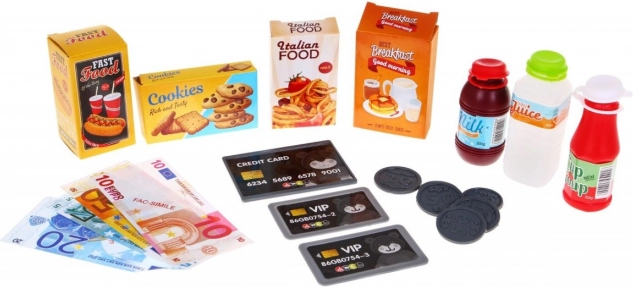 Súprava obsahuje množstvo doplnkov, ako sú imitácie potravinových výrobkov a kartičky (VIP a kreditné karty), ktoré obohacujú detskú fantáziu a umožňujú hrať rolu predajcu v obchode.