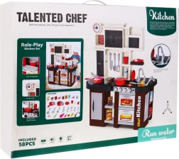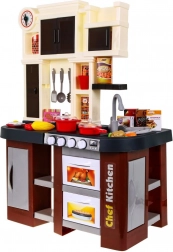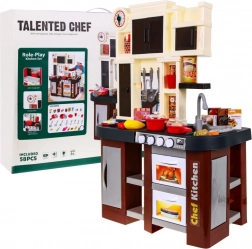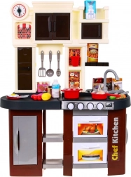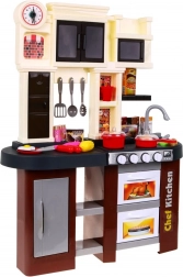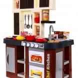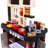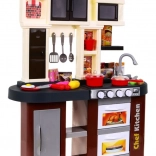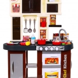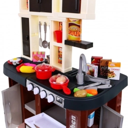 Táto kvalitná detská kuchynka v hnedo‑čiernom prevedení prináša deťom realistický zážitok z varenia. Po otočení gombíkov sa rozsvietia horáky a ozvú sa autentické zvuky varenia a vyprážania. Vďaka kohútiku s tečúcou vodou si malí kuchári vyskúšajú skutočné umývanie riadu a prípravu jedál.