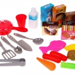 Panvičky, hrnce s pokrievkami, tanieriky, príbory, kuchynské náradie aj zelenina, vajcia a ďalšie „potraviny“ pre nekonečné scenáre hrania.