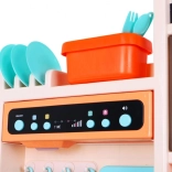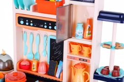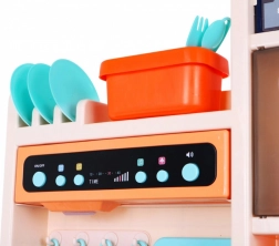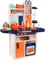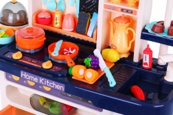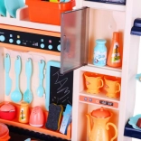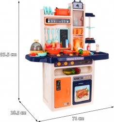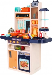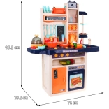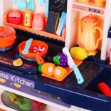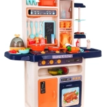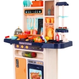 Táto štýlová modrá kuchynka premení hru na varenie na realistický zážitok. Deti si zamilujú tečúcu vodu z funkčného kohútika, podsvietené horáky s efektmi vyprážania a varenia a jeden horák s tvorbou jemnej pary. Nechýba otváracia rúra a chladnička, digestor so svetlom a hudobný panel, hodiny s pohyblivými ručičkami ani praktické poličky na riad.