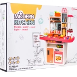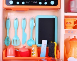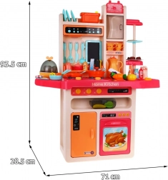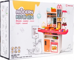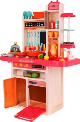 Táto štýlová detská kuchynka podporuje kreativitu a rozvoj jemnej motoriky. Vďaka realistickým funkciám ako tečúca voda, pariací sa horák, svetlá a zvuky si deti užijú autentický zážitok z varenia. Nechýba rúra, chladnička, digestor s lampičkou a bohaté úložné poličky.