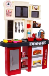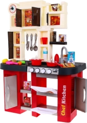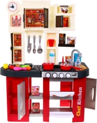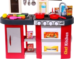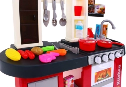 Táto priestranná plastová kuchynka v červeno‑čiernom dizajne prináša deťom od 3 rokov autentický zážitok z varenia. Reálne svetelné efekty a zvuky varenia a vyprážania po otočení gombíkov podporujú kreatívnu hru a rozvoj motoriky. Súčasťou je aj pracujúci vodovodný kohútik, ktorý zábavu posúva na ďalšiu úroveň.