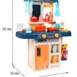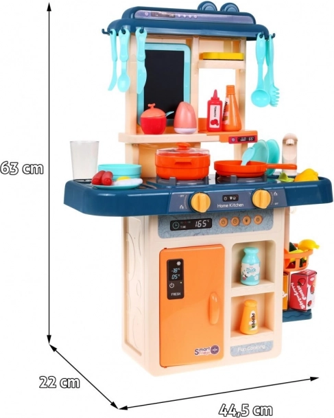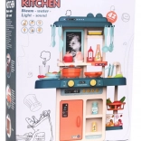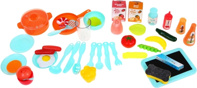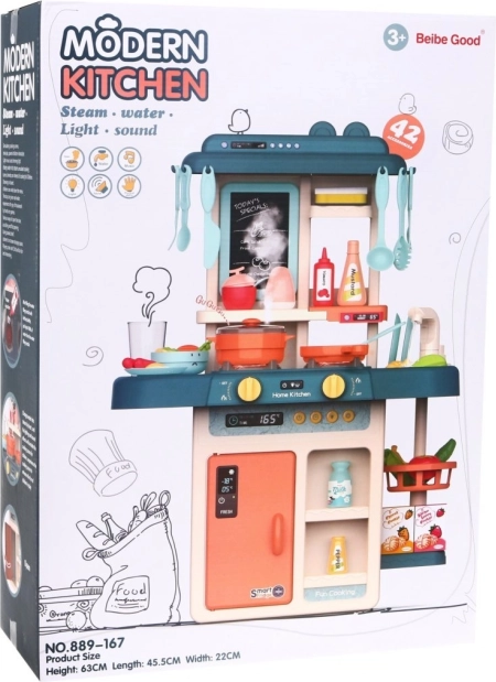 Súčasťou je funkčný drez s kohútikom, do ktorého možno naliať vodu, otvárateľná chladnička, praktické poličky a tabuľa na kriedu (zmazateľná) nad varičom, kde si deti môžu písať svoje recepty alebo zoznamy. Celý set obsahuje 42 prvkov vrátane riadu, potravín a kuchynských doplnkov. Hračka je napájaná 3× AA batériami (nie sú súčasťou) a má certifikáciu CE.