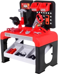 Bohato vybavený detský pracovný ponk pre malých kutilov od 3 rokov prináša 46 dielov náradia a doplnkov. Súčasťou je manuálna vŕtačka, pílky, kladivko, skrutkovač s vymeniteľnými bitmi a úložné boxy. Ponk má otvory na skrutkovanie a pomáha rozvíjať jemnú motoriku, kreativitu a role-play dielňu.