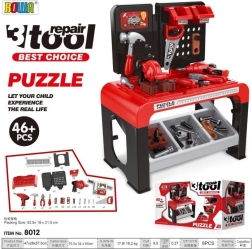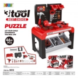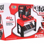Sada obsahuje 46 prvkov vrátane manuálnej vŕtačky, skrutkovača s vymeniteľnými koncovkami, ručnej aj kotúčovej píly, kladivka, klieští, drevených doštičiek na skrutkovanie, skrutiek, kolíkov a klincov. Úložná polička a dva závesné boxy udržia poriadok v náradí, takže po hraní možno všetko ľahko upratať.