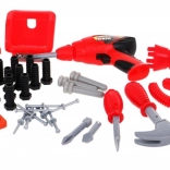 Kompletné vybavenie vrátane vŕtačky, skrutkovača s bitmi, píl, kladivka, klieští, skrutiek a doštičiek pre nekonečné možnosti stavania a opráv.
