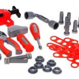 Ľahké plastové nástroje so zaoblenými tvarmi napodobňujú skutočné náradie, aby si deti bezpečne precvičili úchop, skrutkovanie a zatĺkanie.