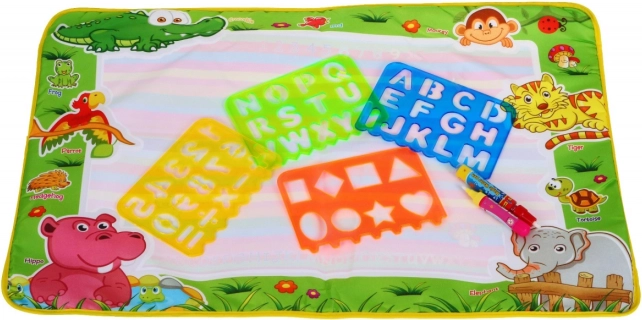 Vodná kresliaca podložka podporuje fantáziu detí a ich schopnosť učiť sa tvarom a farbám prostredníctvom hry.