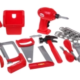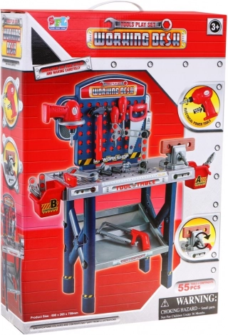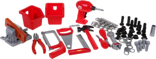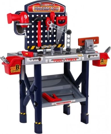 | - dielňa, - zverák, - skrutkovač, - kladivo, - píla, - pílka na kov, - uholník, - kliešte, - 2 x skrutkovač, - kľúč, - výmenná skrutkovacia hlavica, - 4 x hmoždinka, - 8 x skrutka, - 11 x matica, - skrutkovacie drevo, - 8 x obdĺžnikový diel na skrutkovanie, - 2 x box na náradie. | |