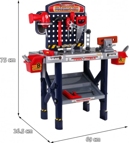 | - dielňa cca 69 cm x 26,5 cm x 75 cm, - skrutkovač cca 13 cm x 15,5 cm, - nádoby na náradie cca 9,5 cm x 9,5 cm, - balenie cca 53 cm x 37 cm x 13 cm. |