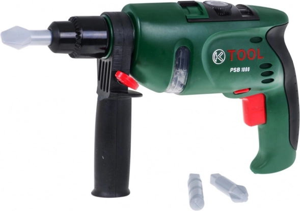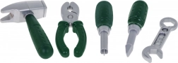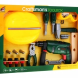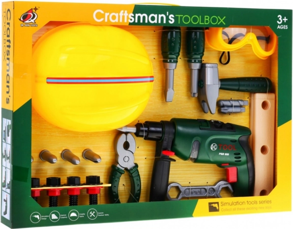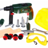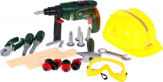 | | Súprava pre kutilov s vŕtačkou, okuliarmi, prilbou a náradím je vhodná pre deti od 3 rokov. Hračka pozitívne ovplyvňuje rozvoj logického myslenia, stimuluje kreativitu a podporuje koordináciu oko-ruka. Skrutkovač je napájaný batériami typu 2 x AA 1,5 V – nie sú súčasťou balenia. | Obsah súpravy |