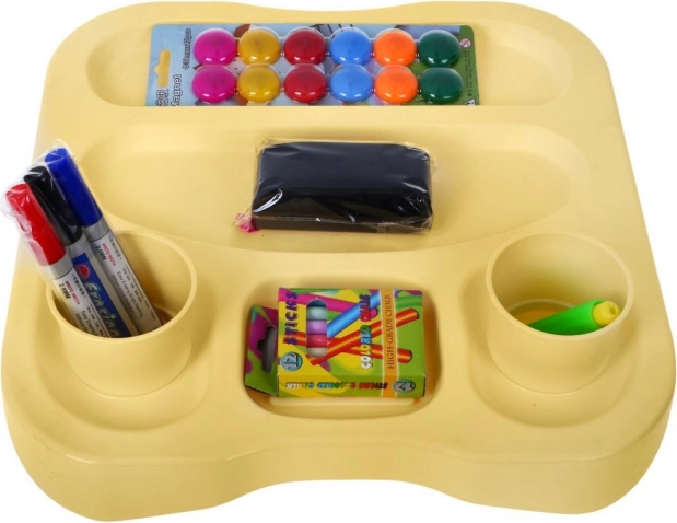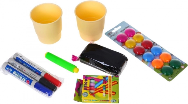 Súčasťou balenia sú plastové poháriky, set fixiek, kried, magnetov a držiak na kriedy, ktoré podporujú všetky druhy umeleckých činností.