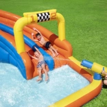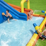 Veľké vodné ihrisko s mnohými atrakciami, ideálne pre letnú zábavu detí.