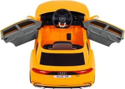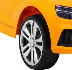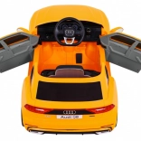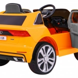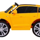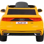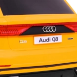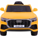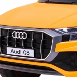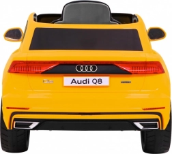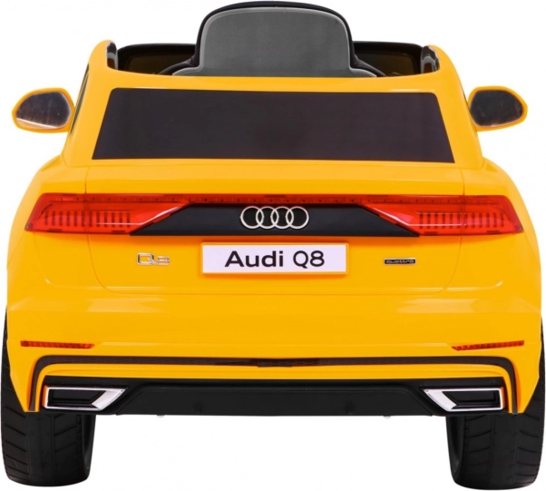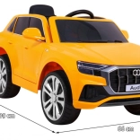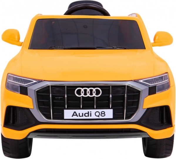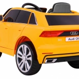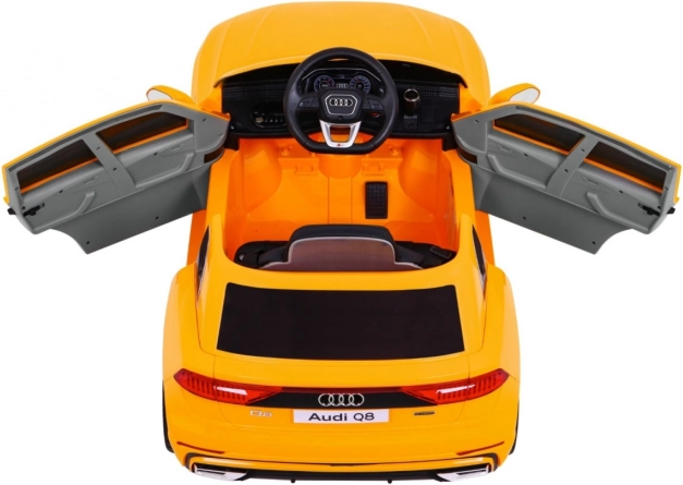 Elektrické auto pre deti v štýle Audi Q8 v žiarivej žltej farbe s realistickými prvkami, ako sú funkčné predné a zadné svetlá, otváracie dvere a diaľkové ovládanie pre rodičovskú kontrolu, zaručuje bezpečnú a zábavnú jazdu.