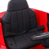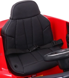 Veľké mäkké kolesá z EVA peny skvelo tlmia nerovnosti, zatiaľ čo pohodlné sedadlo z čiernej ekokože s bezpečnostnými pásmi drží dieťa v bezpečí. Autíčko má LED svetlá vpredu aj vzadu, otváracie dvere s blokádou a prehľadný indikátor nabitia. Multimediálny panel podporuje MP3, USB, TF (SD), AUX a ponúkne aj vstavané melódie a zvuky na volante.