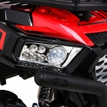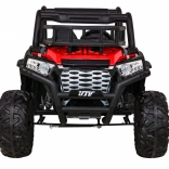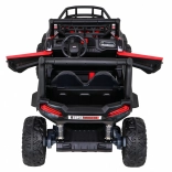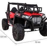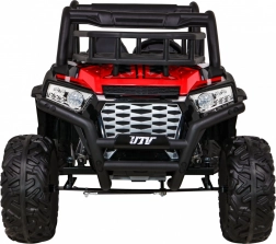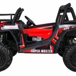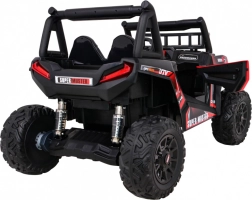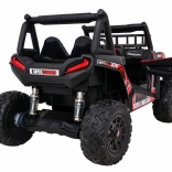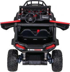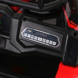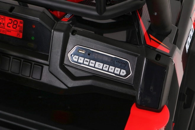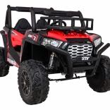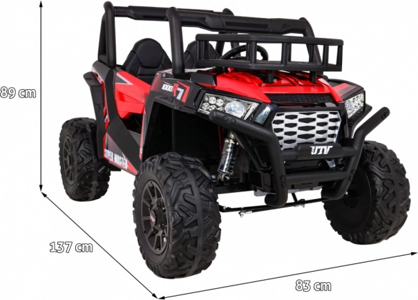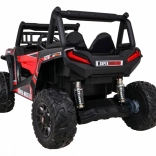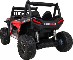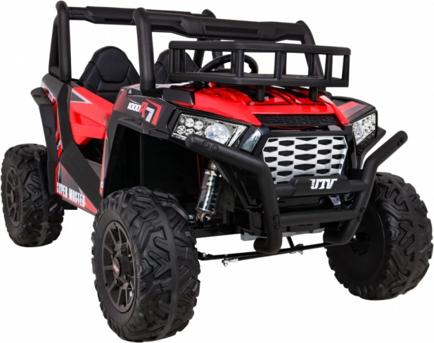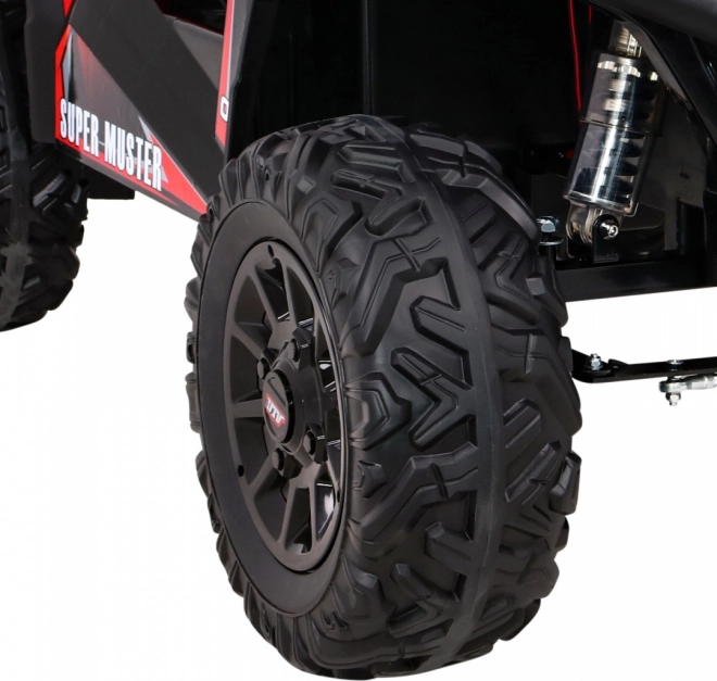 Vyrazte s deťmi do terénu s výkonným buggy UTV 24 V v atraktívnej červenej. Dva motory 2×200 W, veľké EVA kolesá 34×15 cm a štvorbodové odpruženie (2× predné, 2× zadné) s nastaviteľnými tlmičmi zvládnu nerovnosti, obrubníky aj záhradné cestičky. Plynulý štart bez trhnutia chráni malých pasažierov a LED osvetlenie vpredu aj vzadu zaistí viditeľnosť.