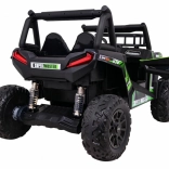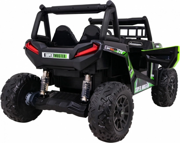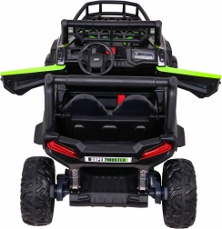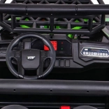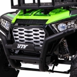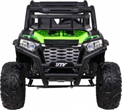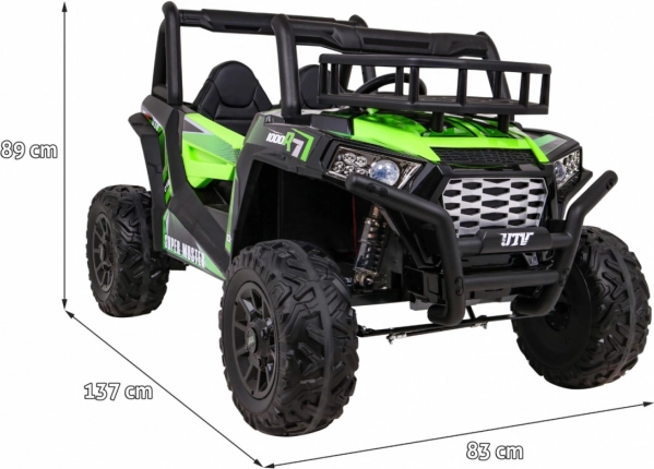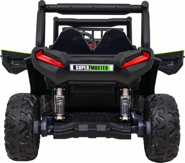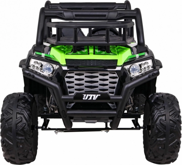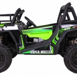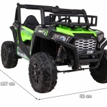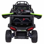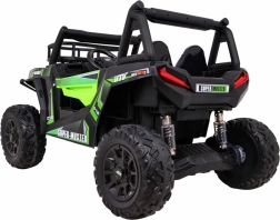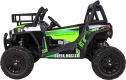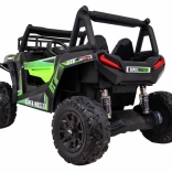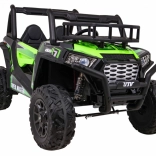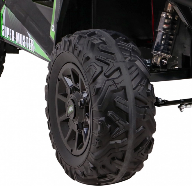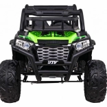 Terénne UTV pre deti v atraktívnej zelenej farbe je stavané na dobrodružstvá. Dva silné motory 2×200 W v spojení s batériou 24 V 7 Ah zabezpečujú dostatok sily aj na nerovný povrch. Penové EVA kolesá 34×15 cm tlmia vibrácie a spolu s odpružením 2× vpredu a 2× vzadu poskytujú komfortnú a stabilnú jazdu.
