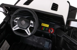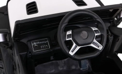 Malí vodiči ocenia štartovanie kľúčom, otváracie dvere s blokovaním, priestranný zadný kufor 44 × 11 × 20 cm a bohatú multimediálnu výbavu: MP3/USB/SD, Bluetooth a zvuky na volante. Rodičia majú všetko pod kontrolou vďaka diaľkovému ovládaču 2,4 GHz s tromi rýchlosťami a bezpečnostným tlačidlom Stop. Pohodlné, ventilované sedadlo z ekokože s bezpečnostnými pásmi zvyšuje komfort a istotu pri jazde. Výkonná batéria 12 V/10 Ah poskytne dlhé minúty zábavy, pričom autíčko unesie až 28 kg a ponúka svetlú výšku 19 cm pre ľahký terén.