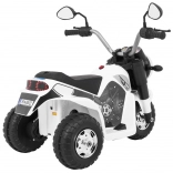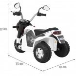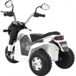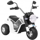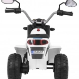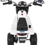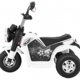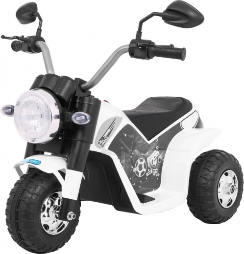 Detská elektrická motorka MiniBike v elegantnej bielej farbe prináša deťom bezpečnú zábavu a prvé skúsenosti s jazdou. Vďaka trom kolesám je stabilná, má predné LED svetlá, zvuk štartu motora a melódie na volante. Poháňa ju motor RS380 6 V s akumulátorom 6 V / 4,5 Ah a komfort zabezpečuje sedadlo z čiernej eko kože.