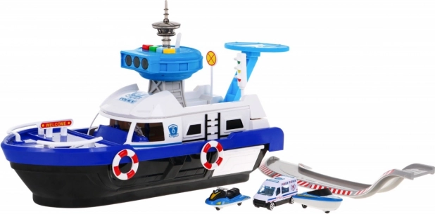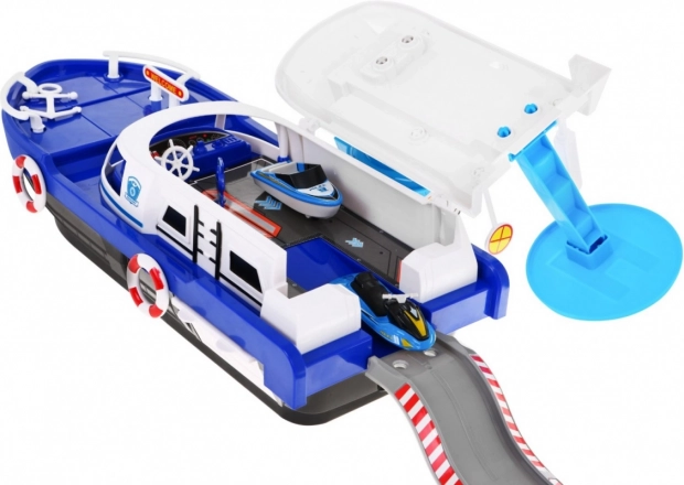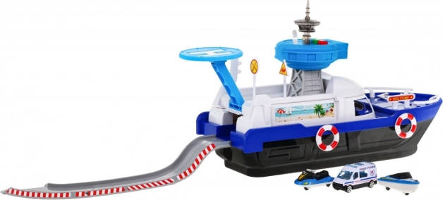 Otváracou strechou môžete odhaliť úložný priestor, ideálny pre pripojenie zábavnej šmykľavky pre autíčka. Súčasťou balenia je aj policajná dodávka, vodný skúter a loďka. Podporuje kreatívne scenáre a silno stimuluje detskú fantáziu: