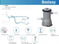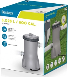 Filtračné čerpadlo Bestway s prietokom 3028 l/h dokáže prečerpať až 3028 litrov vody za hodinu. Správny výber filtračného čerpadla je zásadný pre jeho výkon a efektivitu. Pre správnu funkciu čerpadla sú potrebné vymeniteľné filtre. Jeden papierový filter je súčasťou balenia a možno ho očistiť prepláchnutím pod tečúcou vodou. Odporúča sa výmena filtru každé dva týždne. Čerpadlo je ľahké na montáž i obsluhu a balenie obsahuje návod v češtine. Filtračné čerpadlo je nevyhnutnou súčasťou filtračného systému bazénov, pomáha udržiavať čistú a bezpečnú vodu.