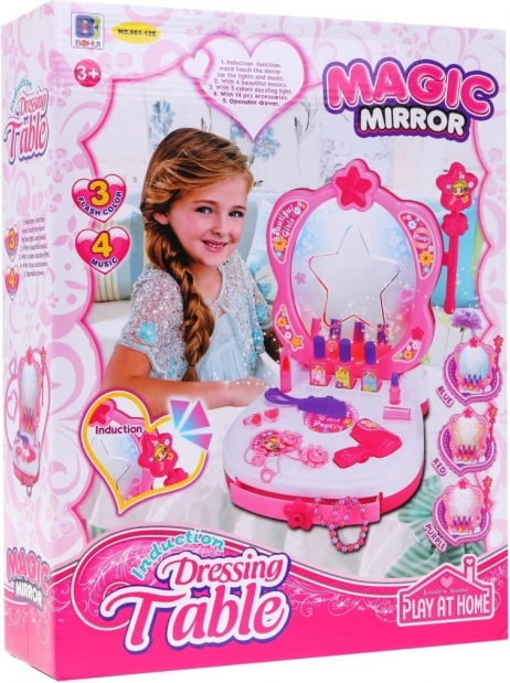 Táto interaktívna ružová toaletka s hviezdnym zrkadlom rozžiari detskú izbu. Zrkadlo svieti v troch farbách (modrá, červená, ružová) a dotvorí kúzelnú atmosféru štyrmi melódiami. Vďaka bohatej výbave deti ľahko napodobnia obľúbené rituály krásy a ponoria sa do sveta fantazijného líčenia a účesov.