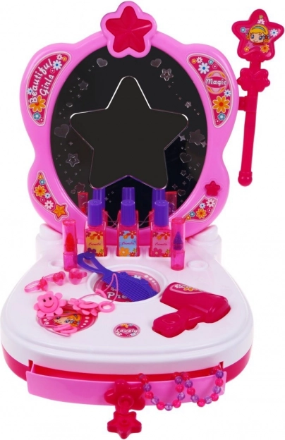 Roztomilá detská toaletka pre malé parádnice od 3 rokov ponúka svietiace hviezdne zrkadlo, hudobný podkres a bohatú sadu doplnkov na kreatívnu hru. S kúzelnou ružovou paličkou, fénom, šperkami a „kozmetikou“ na hranie rozvíja fantáziu aj jemnú motoriku. Napájanie 3× AA (nie sú súčasťou balenia).