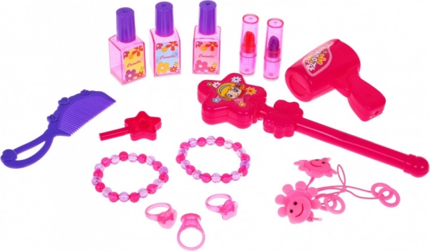 Set je navrhnutý pre bezpečnú a radostnú hru – obsahuje makety kozmetiky, detský fén, hrebeň, šperky a kúzelnú paličku, s ktorou sa každé dievčatko môže cítiť ako princezná. Kompaktné rozmery z neho robia skvelú prenosnú hračku na cesty aj domov.