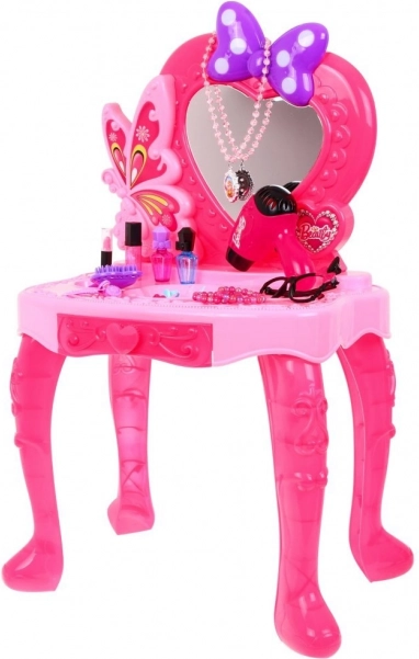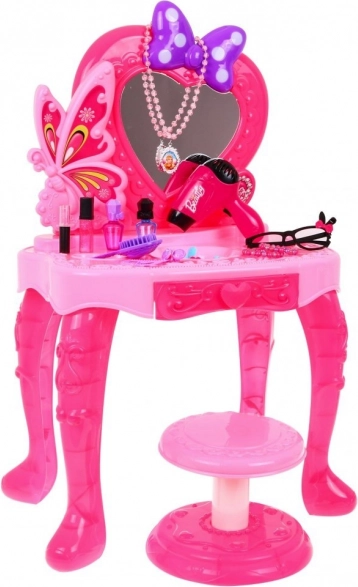 Táto ružová detská toaletka premení každú izbičku na kúzelné kozmetické zákutie. Srdiečkové zrkadlo zdobí mašľa so svetelnými efektmi a príjemná melódia, ktorá podnecuje fantáziu pri hre na salón krásy. Súčasťou je aj funkčná hračka fénu s reálnym zvukom a fúkaním, vďaka čomu je hranie ešte autentickejšie.
