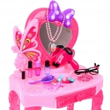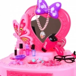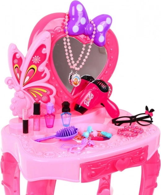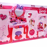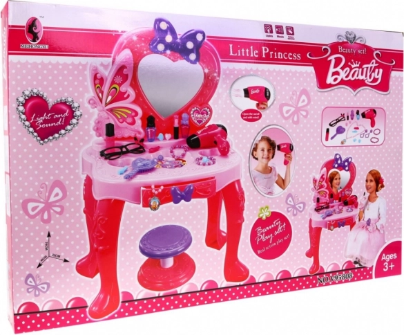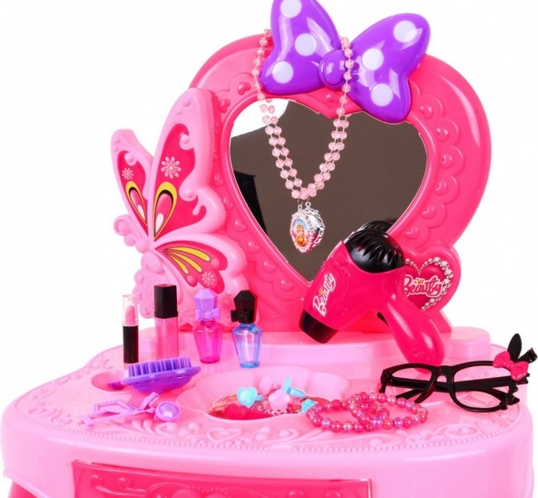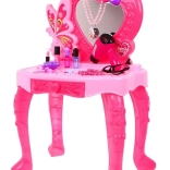 Mašľa nad srdiečkovým zrkadlom sa rozsvieti a bliká, sprevádzaná melódiou. Deti si tak užijú realistickú a pútavú hru na salón krásy.