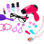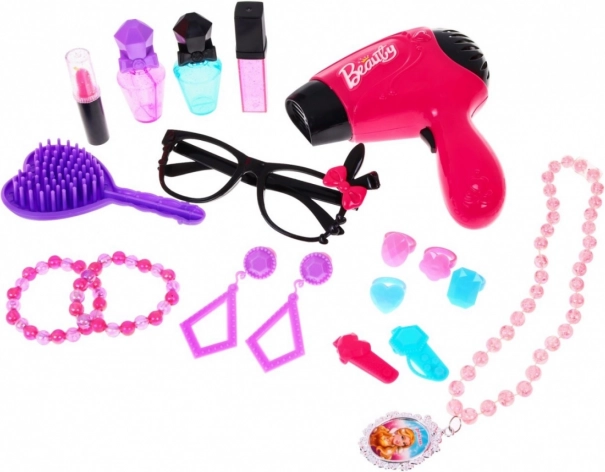 - Toaletka, stolička, fén, okuliare, hrebeň cca 12 × 7 cm, náhrdelník, 2× náramok, 4× prstienok cca 2,5 × 2,5 cm, 2× sponka cca 4 × 2 cm, imitácia rúžu cca 6,5 × 1,5 cm, 3× flakónik cca 7,5 × 3 cm, prívesok s princeznou cca 4 × 3 cm, 2× náušnice, samolepky