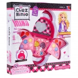 - Otváracia kabelka, zrkadielko, 10× očné tiene, 12× lesk na pery, 2× rúž, 2× lak na nechty, 2× štetec, 3× sponka do vlasov