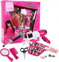 - Opasok s vreckami na nástroje, zrkadielko, hrebeň, nožnice, žehlička na vlasy, 2 sponky, fén