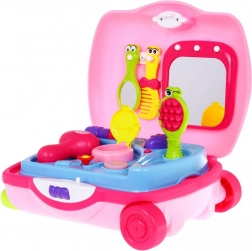 Súčasťou je veľké aj malé zrkadlo, fén, hrebeň, kefa, „parfém“ a „rúž“ (dekoratívne atrapy). Po skončení hrania sa všetko ľahko uprace späť do kufríka na kolieskach s výsuvnou rukoväťou – ideálne riešenie do izby aj na cestovanie.