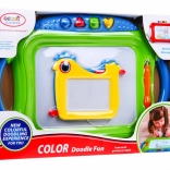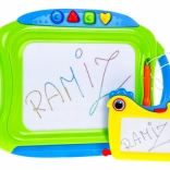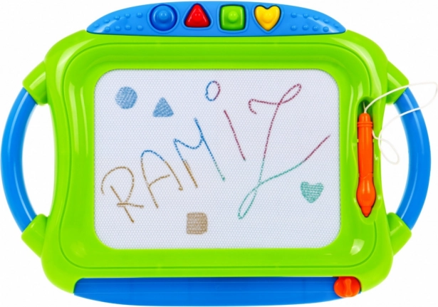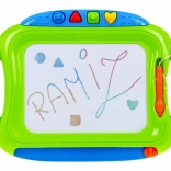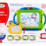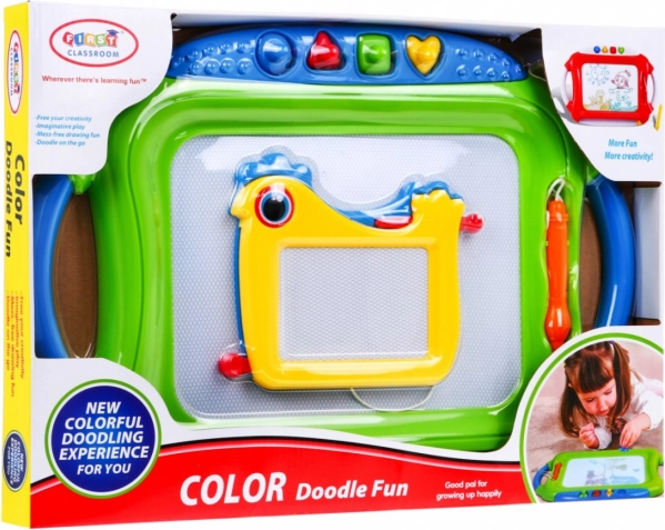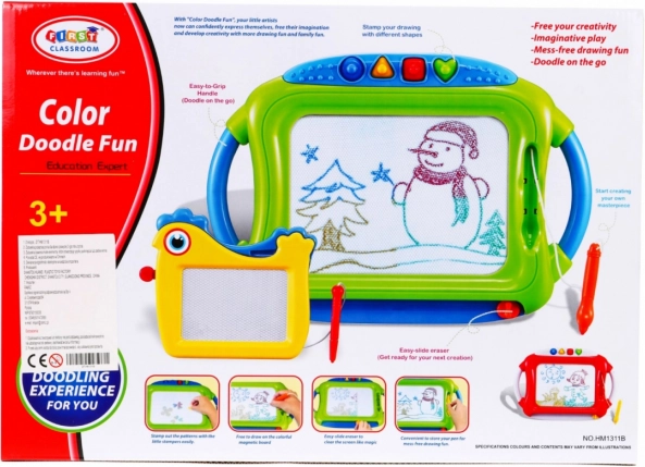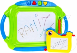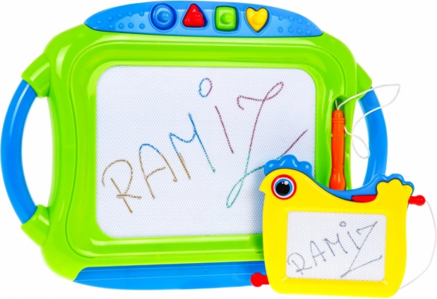 Táto sada obsahuje veľkú magnetickú tabuľu s viacfarebným efektom kreslenia a štyrmi pečiatkami plus menšiu tabuľku s jednofarebným záznamom. Obe tabuľky majú pripevnené rysky na šnúrke, takže sa nestratia, a praktický jazdec na rýchle zmazanie výtvoru.