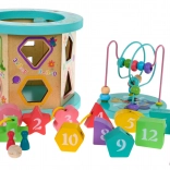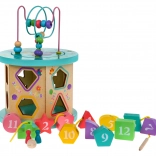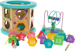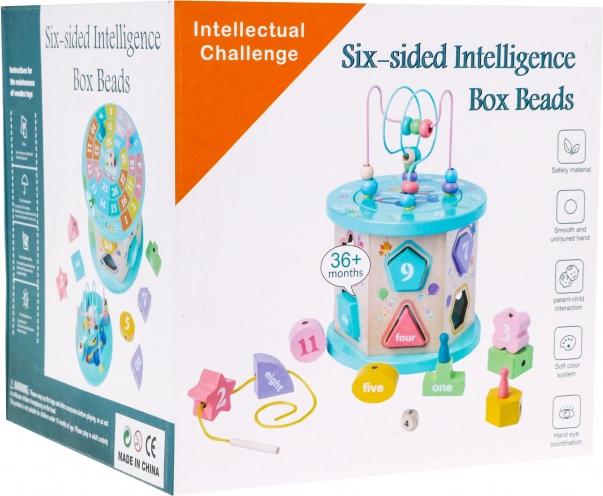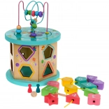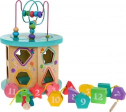 Táto drevená multikocka ponúka hneď niekoľko spôsobov, ako zabaviť vaše dieťa. Horná časť kocky je osadená prekladačkou-labyrintom pre posúvanie farebných korálkov, zatiaľ čo spodná časť obsahuje hraciu plochu.