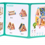 Táto pestrá sada prináša deťom hodiny tvorivej zábavy. V balení nájdete menšie aj väčšie drevené hranoly, farebné dieliky s potlačou (štvorce, obdĺžniky, trojuholníky) a tematické prvky ako stromy, postavičky a autíčko. Vďaka priloženému obrázkovému návodu deti ľahko začnú stavať svoje prvé domčeky a postupne skúšajú zložitejšie stavby.