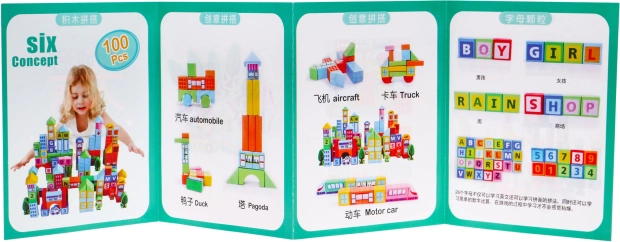 | - 100 drevených kociek rôznych farieb a tvarov, - obrázkový návod. | |