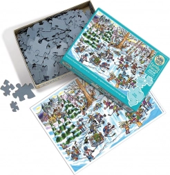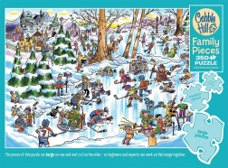 Rodinné puzzle COBBLE HILL Hokejové mestečko je navrhnuté tak, aby si skladanie užila celá rodina naraz. Veľké dieliky sú sústredené v jednej časti motívu a skvele sa hodia pre menšie deti, stredné dieliky pre staršie deti a starých rodičov a drobnejšie dieliky pre dospelých a skúsenejších skladateľov. Farebná zimná ilustrácia s hokejom a korčuľovaním na rybníku pôsobí optimisticky a skvelo vynikne aj ako hotový obraz.
