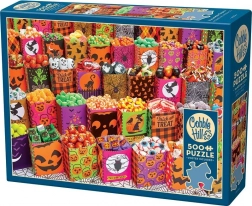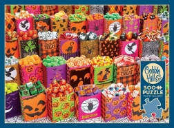 Puzzle COBBLE HILL s motívom halloweenských cukroviniek ponúka unikátnu a náročnú skladačkovú skúsenosť. Vďaka nekonvenčným tvarom dielikov, ktoré nesledujú tradičný mriežkový vzorec, budete pri skladaní potrebovať väčšiu dávku trpezlivosti a umu.